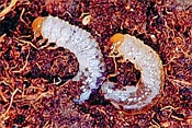 The Japanese beetle is highly destructive during both its larval and adult stages. The larval stage is responsible for the damage done to your lawn and the adult stage is more damaging to ornamental plants. The grubs are about 1" long when mature, white to cream colored, has a dark head, 6 legs and a C-shaped body. The lawn wilts, turns yellow then brown during August or September. The damaged grass will roll up easily. Damage to your lawn also occurs when moles, raccoons, skunks dig up your lawn looking for the grubs.