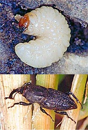 (A.K.A) Turfgrasses, stem-feeding larvae; Adult billbugs are long-snouted, 7mm long, gray-to-black beetles with a strongly tapered abdomen. They can be found walking on hard surfaces in spring prior to depositing eggs in grass sheaths. The plump, legless white larvae first feed inside the stems then on the crowns.